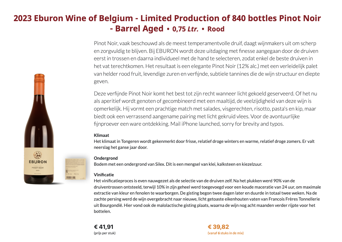 Onderstaand een screenshot, want ik een link gebruik, is die vroeg of laat verdwenen. De beschrijving is ook mooi en uiteraard net zo subjectief als die van mij. Zij moeten er van leven, ik leef er beter van. Qua prijs vind ik de Eburon nogal stevig. Of er een tweede flesje komt, is de vraag. Maar ach, Het Wijnhuis heeft oneindige rijen met de mooiste wijnen. Proberen zou ik zéker doen, want Eburon verrast en laat Frank glimlachen.